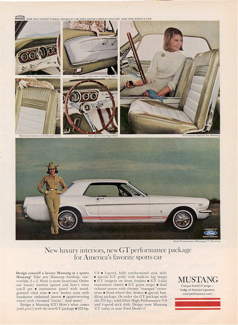The 1965 GT Mustang was available in hardtop, convertible or fastback. It also came with the option of a 225 or 271hp V-8 engine and a 3 or 4 speed manual or cruise-o-matic transmission.