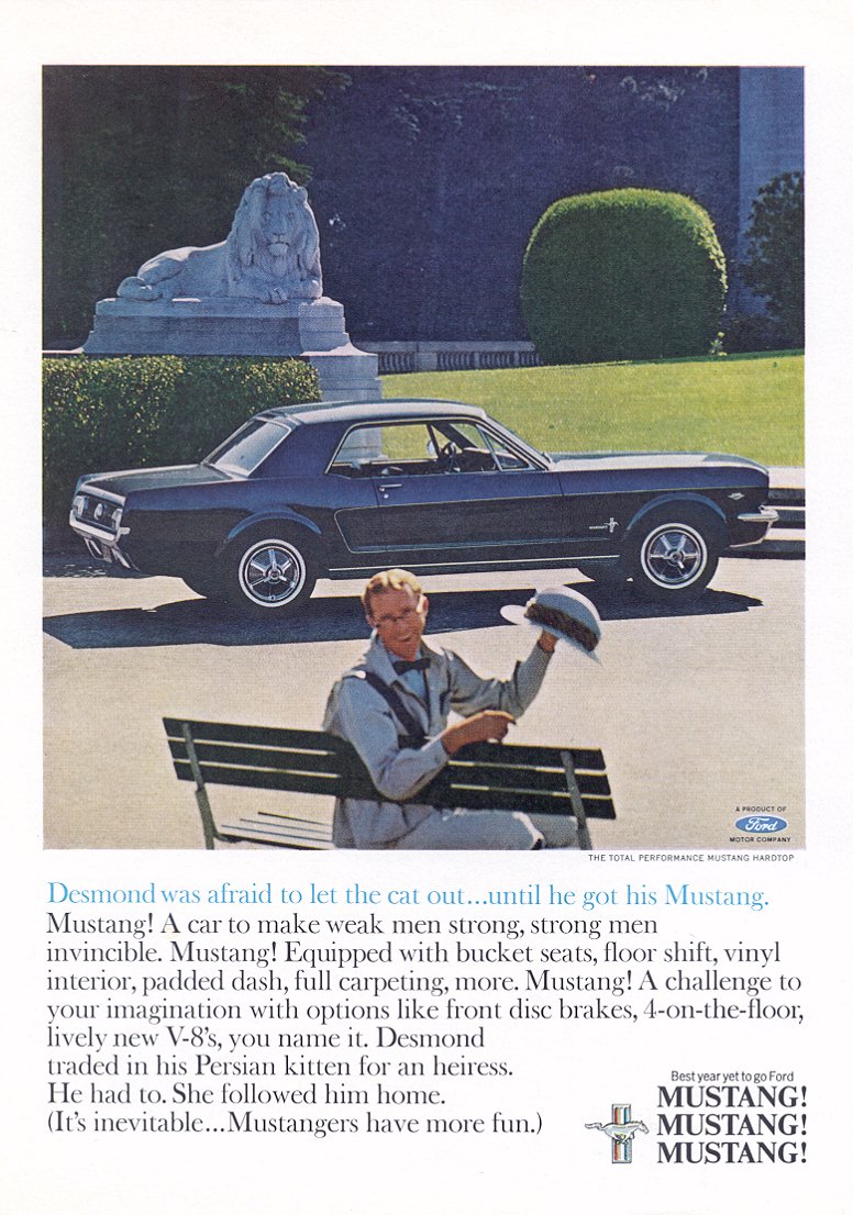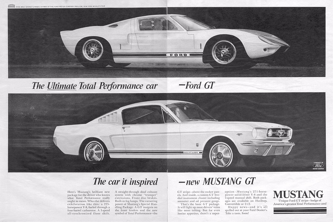 It seems apparent that Ford’s marketing plan was highly sucessful. After giving away 195 1964.5 hardtop Mustangs, Ford then sold 1965 hardtop Mustangs at a 5 to 1 ratio over convertibles and fastback versions. Today, this makes good news for 1965 fastback owners as it is a rarer find. The fastback may not have sold as well in 1965, but it provided a basis for the future Mustang Shelby GT350 which was housed in fastback Mustangs. The 65 fastback was referred to as the “2×2 fastback” because although it was intended as a two person car it had room for two more in the fold down rear seat.