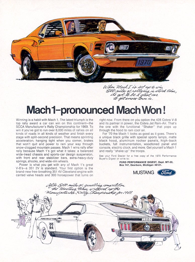 The new Mach I Mustang included the previous engine options of 200cid I-6, 302cid and 390cid V-8 engines as well as the new option of a 351cid V-8. There was also the option of a 428cid big block as a 335 hp cobra jet V-8 with or without ram-air. In 1970, only 857 Mach I models were equipped with the Super Cobra Jet/Drag Pack. The name Cobra Jet came from the fact that the vehicle shook when the engine started or was revved.
