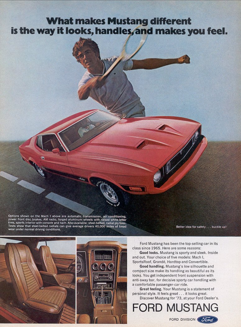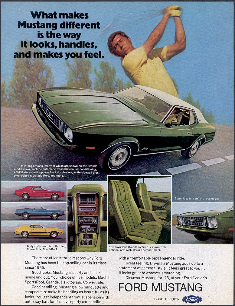 The 1973 Mustang came in five model options; Hardtop, Sportsroof, Grande’, Convertible and Mach 1. The 74 Mustangs sported a new re-designed honeycomb textured grille, new color keyed hood and fender moldings, and new urethane front bumper. Many previous options had now become standard and racing side mirrors were now available on all the models. They also came with the new option of knitted vinyl interior.