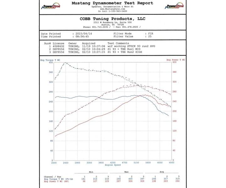 Along with the purchase, you get COBB’s AccessPort TM, featuring a variety of custom “tunes” allowing you to choose from three custom dyno tunes, plus the original Ford factory tune. Select the tune and fuel grade you want to match the type of driving you are doing; a performance tune using 93 octane, or an economy tune using 87 octane for maximum fuel economy on the highway.